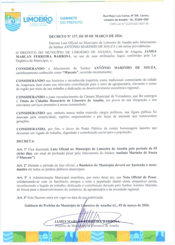 A Prefeitura de Limoeiro de Anadia decretou luto oficial de três dias em razão do falecimento do empresário Antônio Marinho de Souza, conhecido carinhosamente como “Mascate”. A medida foi oficializada por meio do Decreto nº 137, assinado no dia 5 de março de 2026 pelo prefeito Marlan Ferreira, como forma de homenagear a memória de um cidadão que deixou importantes contribuições para o desenvolvimento do município.